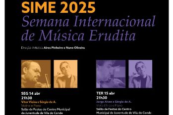 A Semana Internacional de Música Erudita (SIME) já esta a decorrer em Vila do Conde e prolonga-se até quinta-feira, com direção artística de Aires Pinheiro e Nuno Oliveira. O evento organizado pelo Conservatório de Música, Teatro e Dança, integra recitais com músicos de renome nacional e internacional, contanto com atuações diárias em vários espaços culturais da cidade. Hoje, no salão de Festas do Centro Municipal da Juventude, pelas 21h30, apresenta-se ao público Jorge Alves (Viola d’arco) acompanhado por Sérgio de A (Piano). Na quarta-feira o palco muda-se para a Alfandega Régia, onde, pelas 21h30, atuam os guitarristas Dejan Ivanovic e Michalis Kontaxakis. O evento encerra, na quinta-feira às 18h30, com um concerto protagonizado pelos alunos dos Cursos de Aperfeiçoamento Musical de Vila do Conde (CAMus), no Centro Municipal de Juventude. A SIME realiza-se anualmente durante a Semana Santa e promove a excelência da música erudita, combinando formação e apresentação artística numa programação acessível ao público e enriquecedora para os jovens músicos em formação.